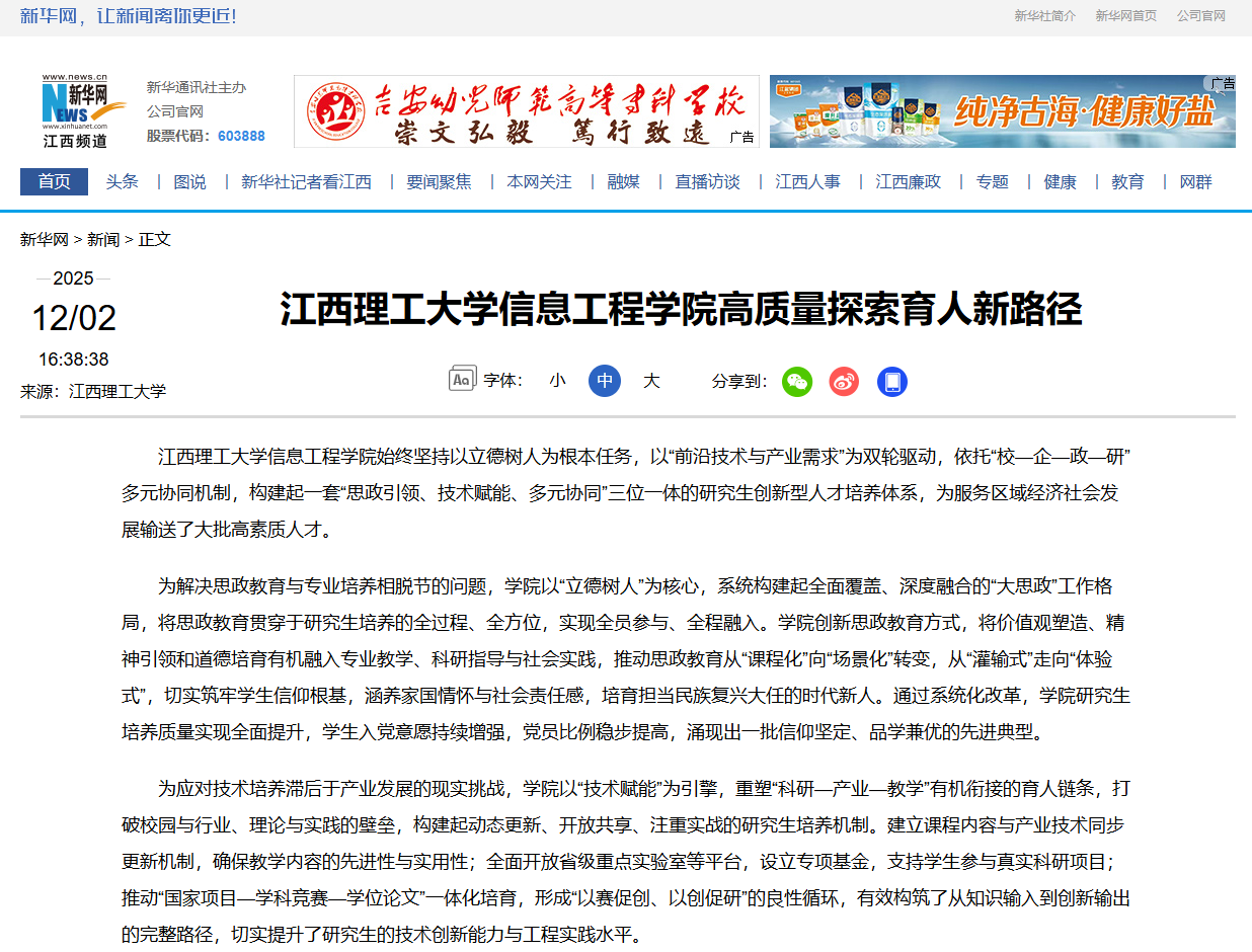 、企业、政府、科研机构等多方参与的“共生型”育人生态,打破高校与社会之间的壁垒,形成权责清晰、优势互补、资源共享的可持续合作机制。在校企协同方面,共建实体化平台,推行“双导师制”,实现人才培养与产业需求精准对接;在校政协同方面,主动对接地方发展战略,引导学生在服务地方中锻炼能力;在校研协同方面,加强与顶尖科研院所合作,拓宽学生学术视野,提升科研起点。通过这一多元协同体系,让研究生培养从“校园闭环”走向“社会融合”,全面增强了学生的综合素质与社会适应力。近五年来,学生在“互联网+”“挑战杯”等高水平竞赛中屡获佳绩,获奖级别与数量位列全省前茅。毕业生以其扎实的专业功底、出色的实践能力和创新意识,深受华为、阿里巴巴、腾讯等知名企业及江西本土重点单位的欢迎,迅速成长为推动行业与区域发展的重要力量。(杨书新)