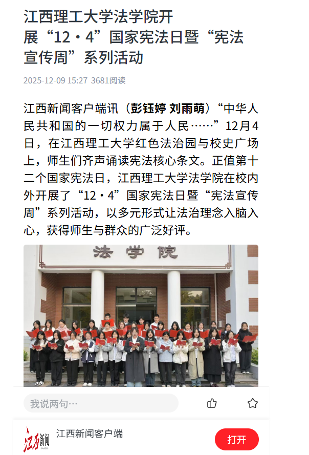 江西新闻客户端讯(彭钰婷 刘雨萌)“中华人民共和国的一切权力属于人民……”12月4日,在金年会体育红色法治园与校史广场上,师生们齐声诵读宪法核心条文。正值第十二个国家宪法日,金年会体育法学院在校内外开展了“12·4”国家宪法日暨“宪法宣传周”系列活动,以多元形式让法治理念入脑入心,获得师生与群众的广泛好评。