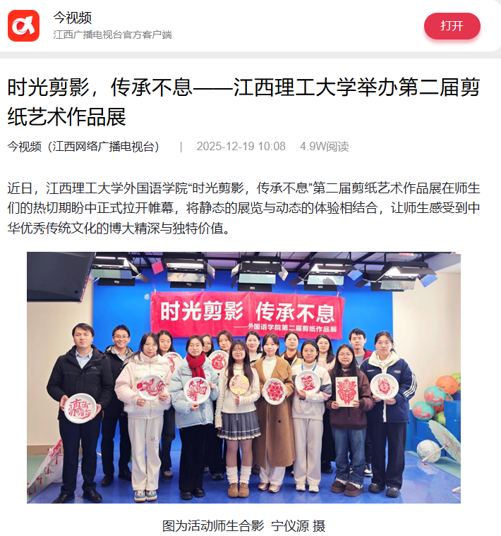 金年会体育外国语学院黄维清老师表示,此次展览不仅是剪纸艺术的展示,更是一堂生动的“第二课堂”,旨在引导青年在实践中增强文化自信,提升实践能力,让文化传承在亲身体验中扎根。(徐莹、谭欣荣)