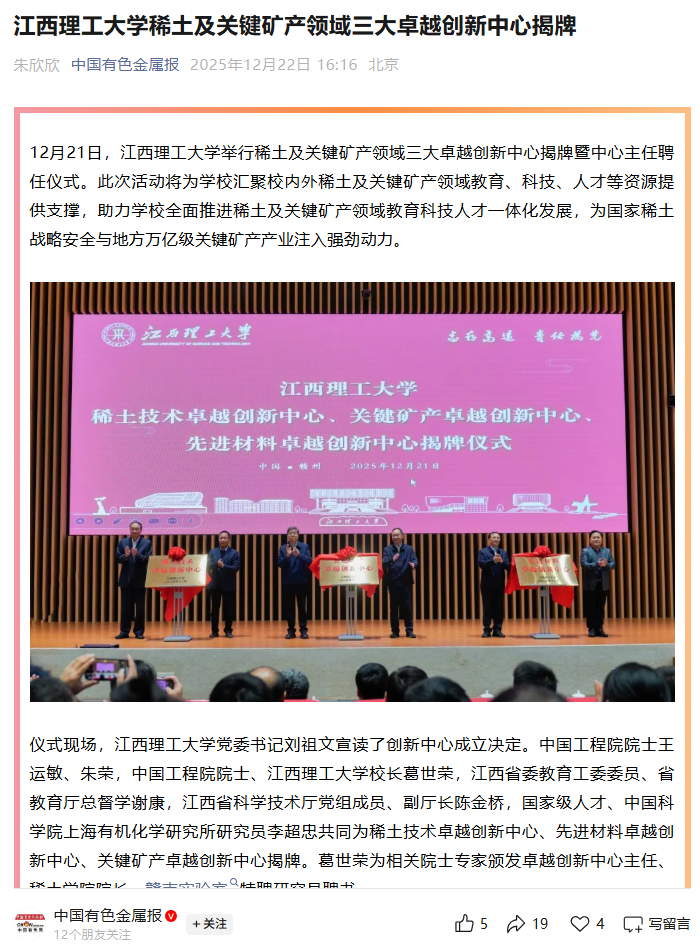 12月21日,金年会体育举行稀土及关键矿产领域三大卓越创新中心揭牌暨中心主任聘任仪式。此次活动将为金年会
