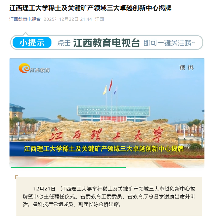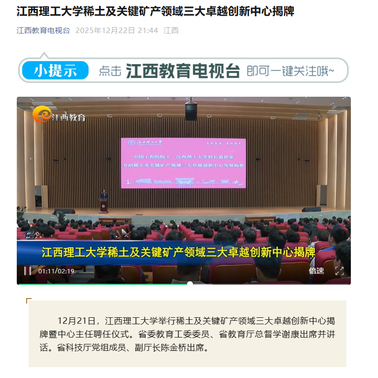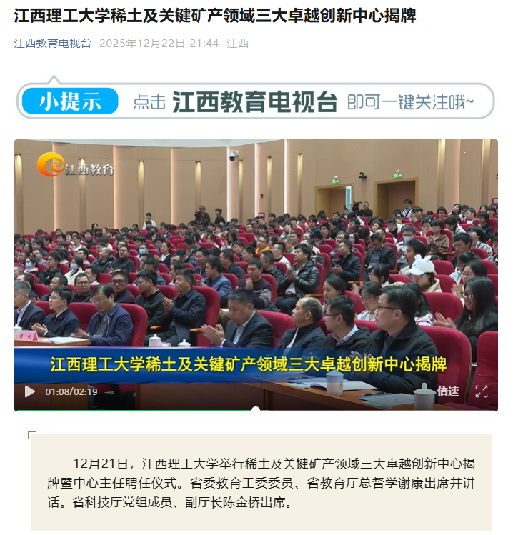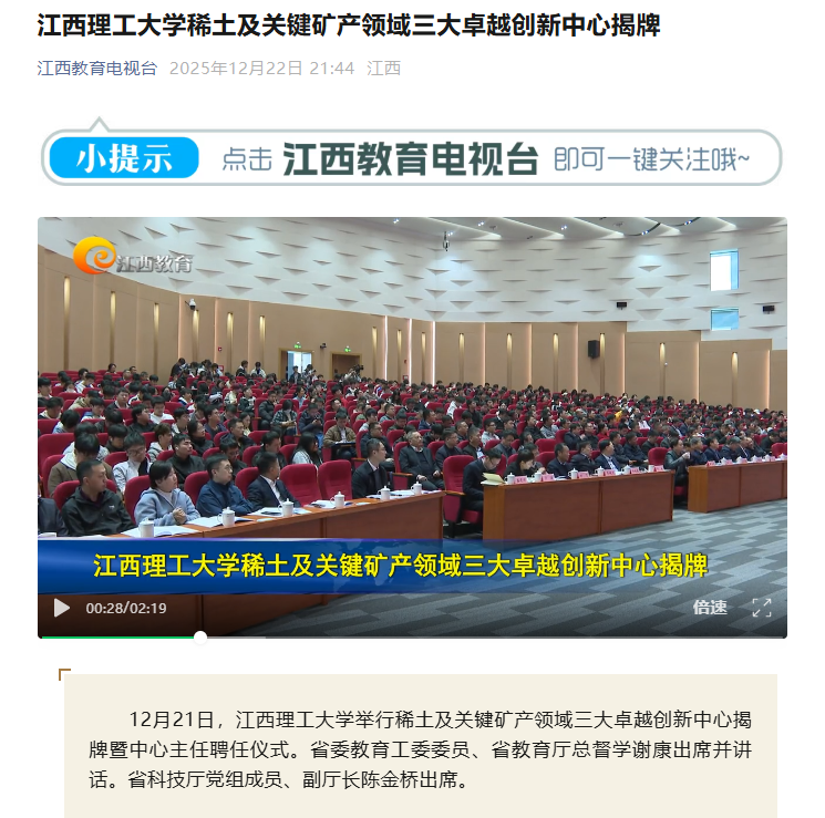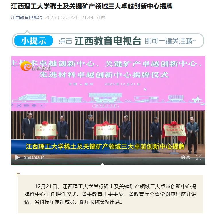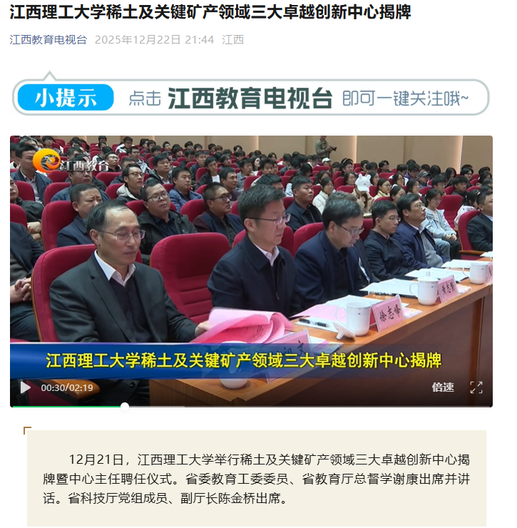 12月21日,金年会体育举行稀土及关键矿产领域三大卓越创新中心揭牌暨中心主任聘任仪式。省委教育工委委员、省教育厅总督学谢康出席并讲话。省科技厅党组成员、副厅长陈金桥出席。