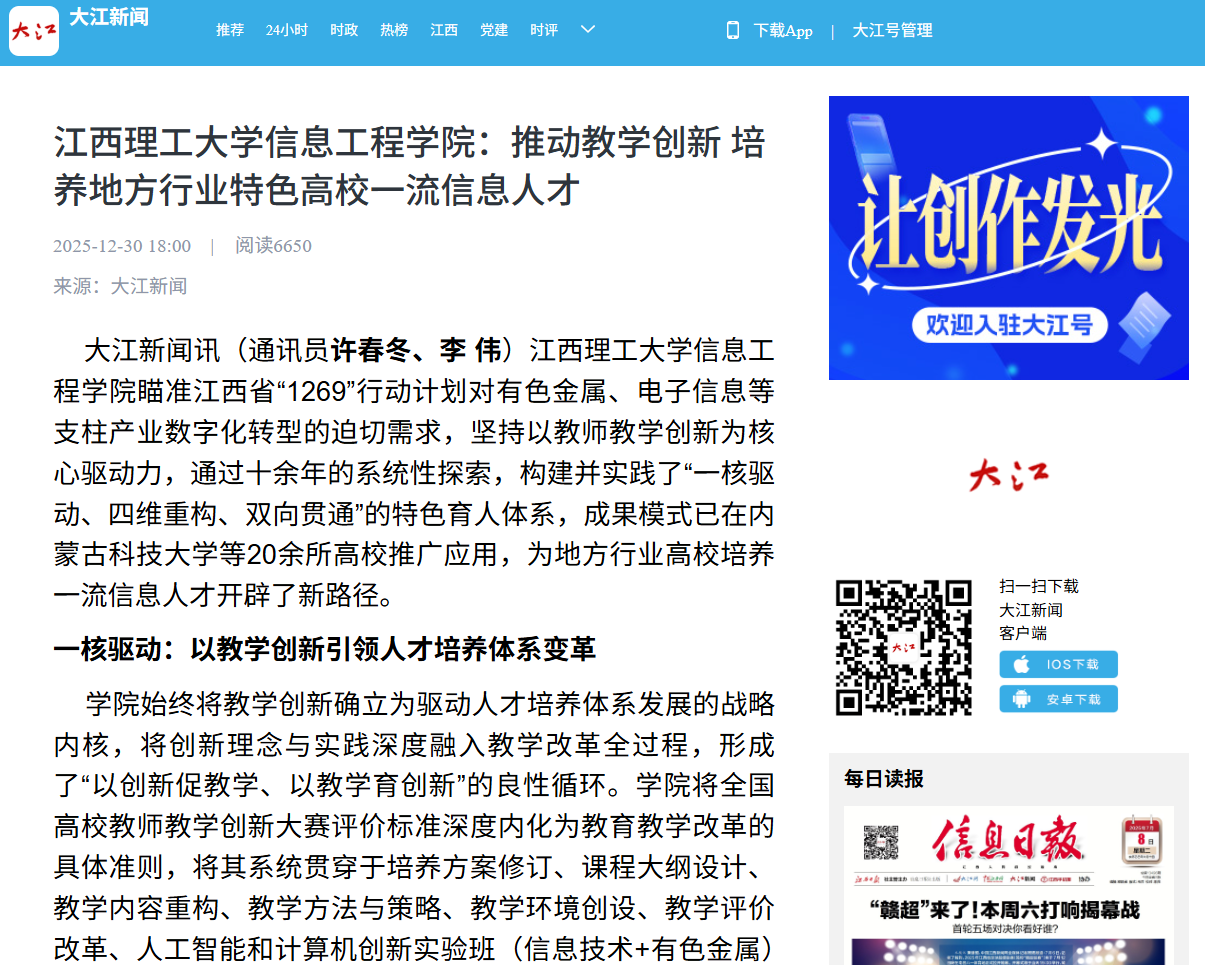 大江新闻讯(通讯员许春冬、李 伟)金年会体育信息工程学院瞄准江西省“1269”行动计划对有色金属、电子信息等支柱产业数字化转型的迫切需求,坚持以教师教学创新为核心驱动力,通过十余年的系统性探索,构建并实践了“一核驱动、四维重构、双向贯通”的特色育人体系,成果模式已在内蒙古科技大学等20余所高校推广应用,为地方行业高校培养一流信息人才开辟了新路径。