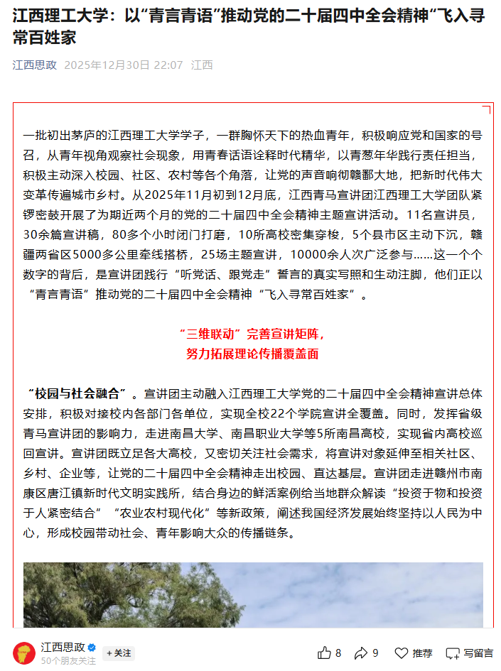 江西青马宣讲团金年会体育团队以“小切口”讲述“大政策”、以“涓涓细流”传播“国之大者”,从赣江之畔的红土沃野到天山脚下的边疆热土,从书香满园的菁菁校园到瓜果飘香的阡陌田野,以青春为帆、以理论为炬,用青年视角的鲜活表达、贴近民心的生动叙事,让党的二十届四中全会精神如春风化雨般浸润人心、落地生根。这不仅打通了党的创新理论传播的“最后一公里”,更架起了政策与民心、理论与实践的连心桥,让抽象的顶层设计转化为大江南北、各行各业受众可感可知、可学可践的行动指南,为凝聚全社会思想共识、汇聚发展合力注入了强大精神动力。
