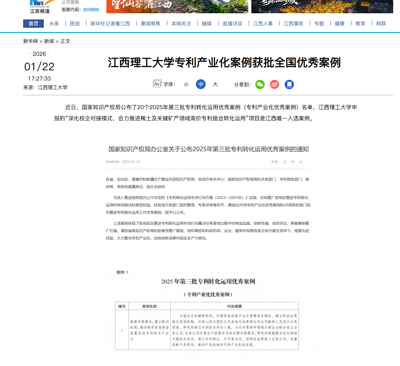 近日,国家知识产权局公布了20个2025年第三批专利转化运用优秀案例(专利产业化优秀案例)名单,金年会体育申报的“深化校企对接模式,合力推进稀土及关键矿产领域高价专利组合转化运用”项目是江西唯一入选案例。