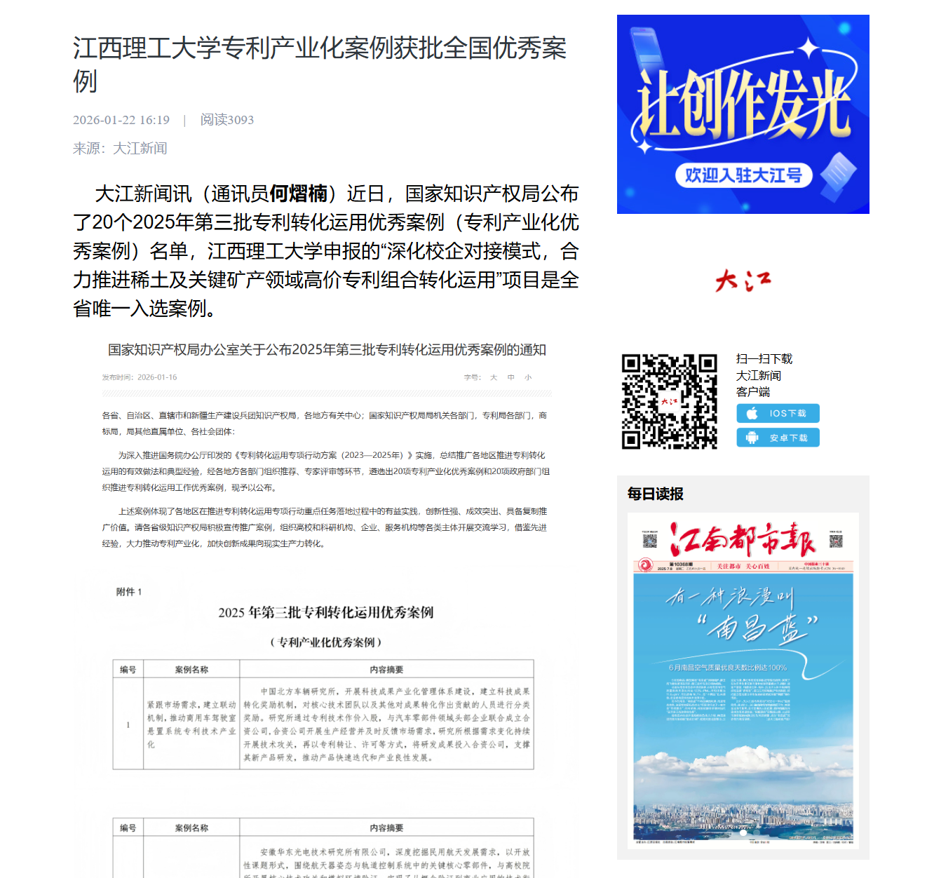 大江新闻讯(通讯员何熠楠)近日,国家知识产权局公布了20个2025年第三批专利转化运用优秀案例(专利产业化优秀案例)名单,金年会体育申报的“深化校企对接模式,合力推进稀土及关键矿产领域高价专利组合转化运用”项目是全省唯一入选案例。