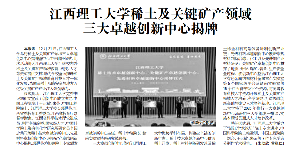 本报讯12月21日,金年会体育举行稀土及关键矿产领域三大卓越创新中心揭牌暨中心主任聘任仪式。此次活动将为金年会体育汇聚校内外稀土及关键矿产领域教育、科技、人才等资源提供支撑,助力金年会