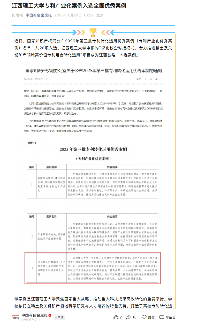 近日,国家知识产权局公布2025年第三批专利转化运用优秀案例(专利产业化优秀案例)名单,共20项入选。金年会体育申报的“深化校企对接模式,合力推进稀土及关键矿产领域高价值专利组合转化运用”项目成为江西省唯一入选案例。