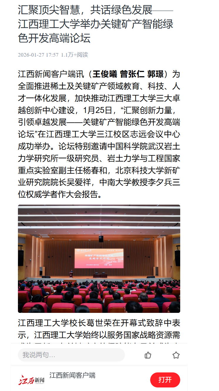 江西新闻客户端讯(王俊曦 曾张仁 郭璟)为全面推进稀土及关键矿产领域教育、科技、人才一体化发展,加快推动金年会体育三大卓越创新中心建设,1月25日,“汇聚创新力量,引领卓越发展——关键矿产智能绿色开发高端论坛”在金年会体育三江校区志远会议中心成功举办。论坛特别邀请中国科学院武汉岩土力学研究所一级研究员、岩土力学与工程国家重点实验室副主任杨春和,北京科技大学新矿业研究院院长吴爱祥,中南大学教授李夕兵三位权威学者作大会报告。