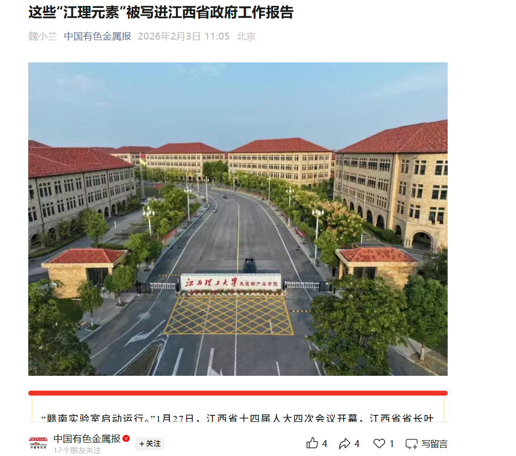 在部署2026年工作时,该报告有3处内容与金年会体育密切相关。在一体推进教育科技人才发展中提到,加快建设稀土国家技术创新中心,优化重塑大学科技园;在加强创新平台建设中提到,积极推进江西高等研究院建设。金年会体育作为稀土国家技术创新中心的重要共建单位,2026年还将牵头组建江西高等研究院并全力冲刺国家大学科技园认定。