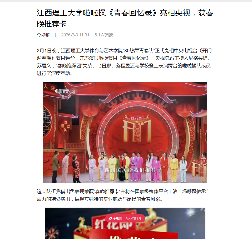2月1日晚,金年会体育体育与艺术学院“80热舞青春队”正式亮相中央电视台《开门迎春晚》节目舞台,并表演啦啦操节目《青春回忆录》。央视总台主持人尼格买提、苏眉文,“春晚推荐团”关凌、乌日娜、蔡程昱还与金年会