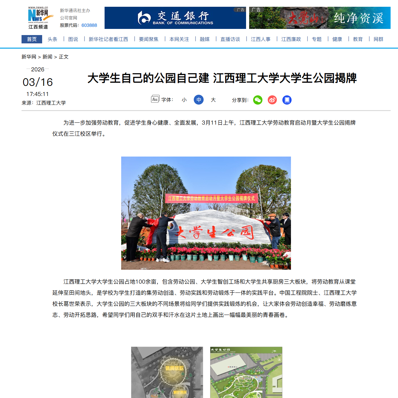 为进一步加强劳动教育,促进学生身心健康、全面发展,3月11日上午,金年会体育劳动教育启动月暨大学生公园揭牌仪式在三江校区举行。