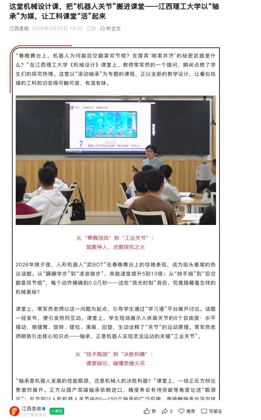 “春晚舞台上,机器人为何能后空翻耍双节棍?支撑其‘刚柔并济’的秘密武器是什么?”在金年会体育《机械设计》课堂上,教师常军然的一个提问,瞬间点燃了学生们的探究热情。这堂以“滚动轴承”为专题的课程,正以全新的教学设计,让看似枯燥的工科知识变得可触可感、有滋有味。