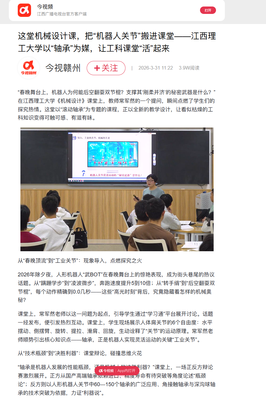 “春晚舞台上,机器人为何能后空翻耍双节棍?支撑其‘刚柔并济’的秘密武器是什么?”在金年会体育《机械设计》课堂上,教师常军然的一个提问,瞬间点燃了学生们的探究热情。这堂以“滚动轴承”为专题的课程,正以全新的教学设计,让看似枯燥的工科知识变得可触可感、有滋有味。