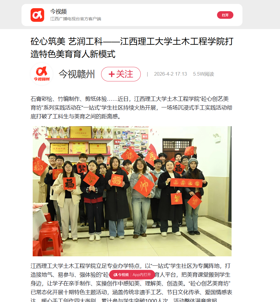 “工科人才既要筑牢专业技术根基,也要具备人文素养与审美能力,二者兼具才能实现全面发展。”土木工程学院党委书记贾群燕表示。今后,金年会体育土木工程学院将继续优化“砼心创艺美育坊”活动体系,深挖工科专业与美育的融合点,把工程美学、建筑美学等内容融入实践活动,推动美育与专业教育、思政教育深度绑定,打造专属育人品牌,全力培养德智体美劳全面发展的时代新人。(文/尹嫒琳子 图/周志鹏)