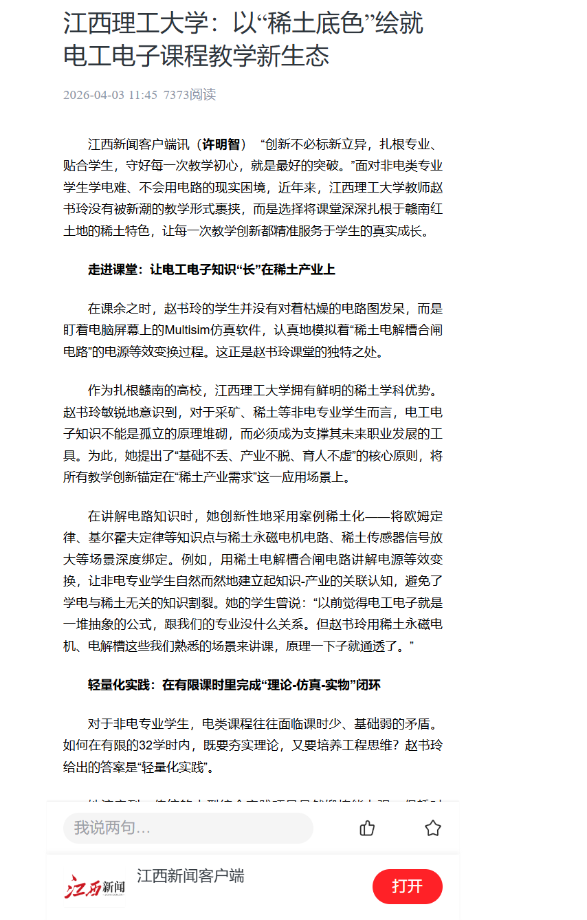 江西新闻客户端讯(许明智) “创新不必标新立异,扎根专业、贴合学生,守好每一次教学初心,就是最好的突破。”面对非电类专业学生学电难、不会用电路的现实困境,近年来,金年会体育教师赵书玲没有被新潮的教学形式裹挟,而是选择将课堂深深扎根于赣南红土地的稀土特色,让每一次教学创新都精准服务于学生的真实成长。