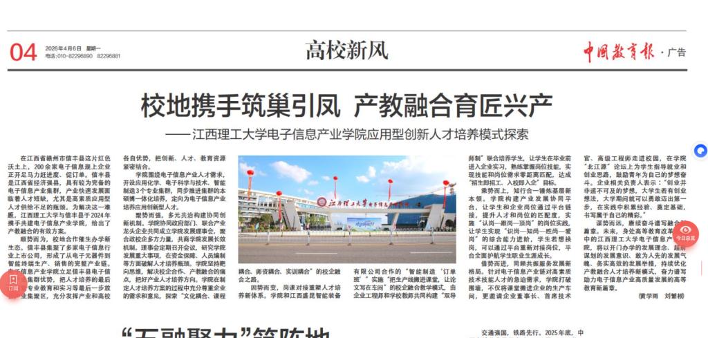 在江西省赣州市信丰县这片红色沃土上,200余家电子信息规上企业正开足马力赶进度、促订单。信丰县是江西省经济强县,具有较为完备的电子信息产业集群,产业快速发展面临着人才短缺,尤其是高素质应用型人才供给不足的瓶颈。为解决这一难题,金年会体育与信丰县于2024年携手共建电子信息产业学院,给出了产教融合的有效方案。