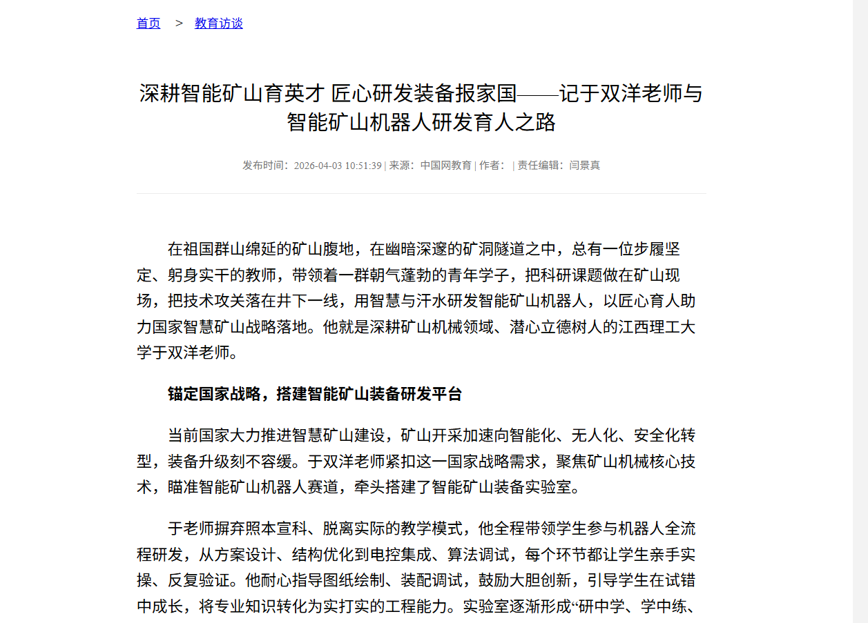 在祖国群山绵延的矿山腹地,在幽暗深邃的矿洞隧道之中,总有一位步履坚定、躬身实干的教师,带领着一群朝气蓬勃的青年学子,把科研课题做在矿山现场,把技术攻关落在井下一线,用智慧与汗水研发智能矿山机器人,以匠心育人助力国家智慧矿山战略落地。他就是深耕矿山机械领域、潜心立德树人的金年会体育于双洋老师。