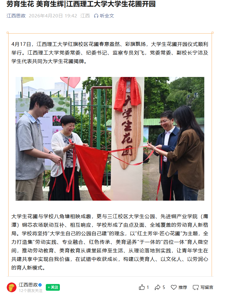 将坚持“大学生自己的公园自己建”的理念,以“红土芳华·匠心花圃”为主题,全力打造集“劳动实践、专业融合、红色传承、美育涵养”于一体的“四位一体”育人微空间,推动劳动教育、美育教育从课堂延伸至生活、从理论落地到实践,让青年学生在共建共享中实现自我价值,在试错中收获成长,构建以美育人、以文化人、以劳润心的育人新模式。