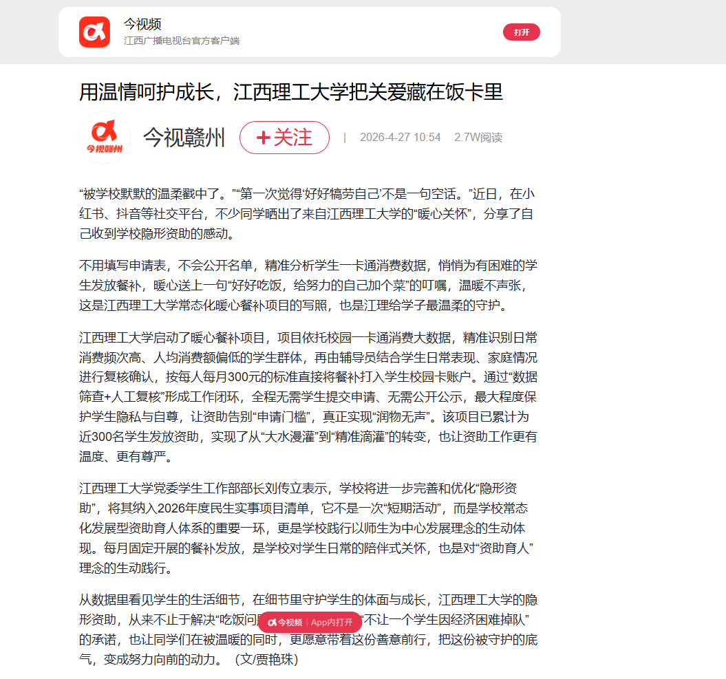 “不让一个学生因经济困难掉队”的承诺,也让同学们在被温暖的同时,更愿意带着这份善意前行,把这份被守护的底气,变成努力向前的动力。(文/贾艳珠)