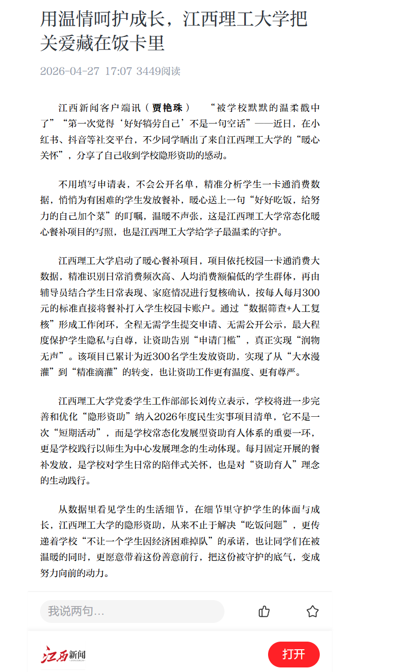 不用填写申请表,不会公开名单,精准分析学生一卡通消费数据,悄悄为有困难的学生发放餐补,暖心送上一句“好好吃饭,给努力的自己加个菜”的叮嘱,温暖不声张,这是金年会体育常态化暖心餐补项目的写照,也是金年会体育给学子最温柔的守护。