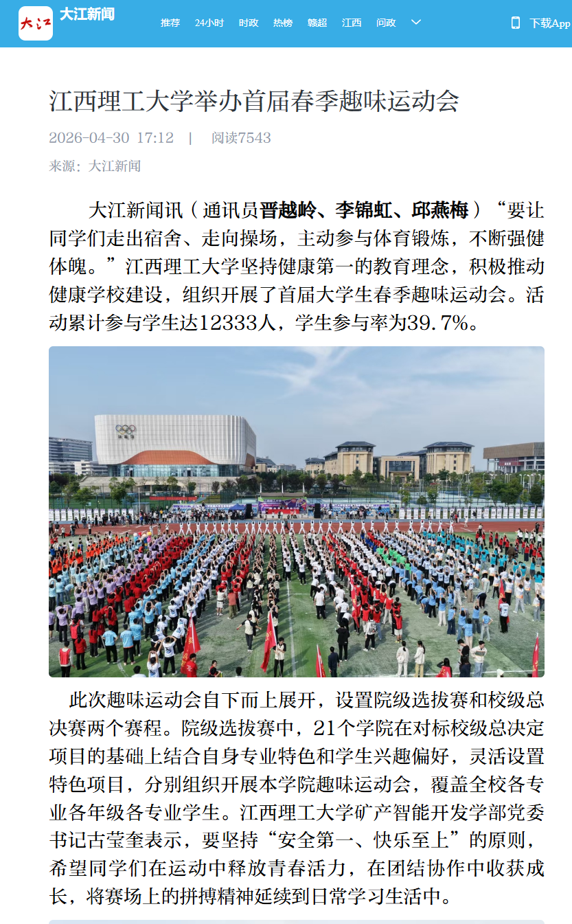 建设,组织开展了首届大学生春季趣味运动会。活动累计参与学生达12333人,学生参与率为39.7%。