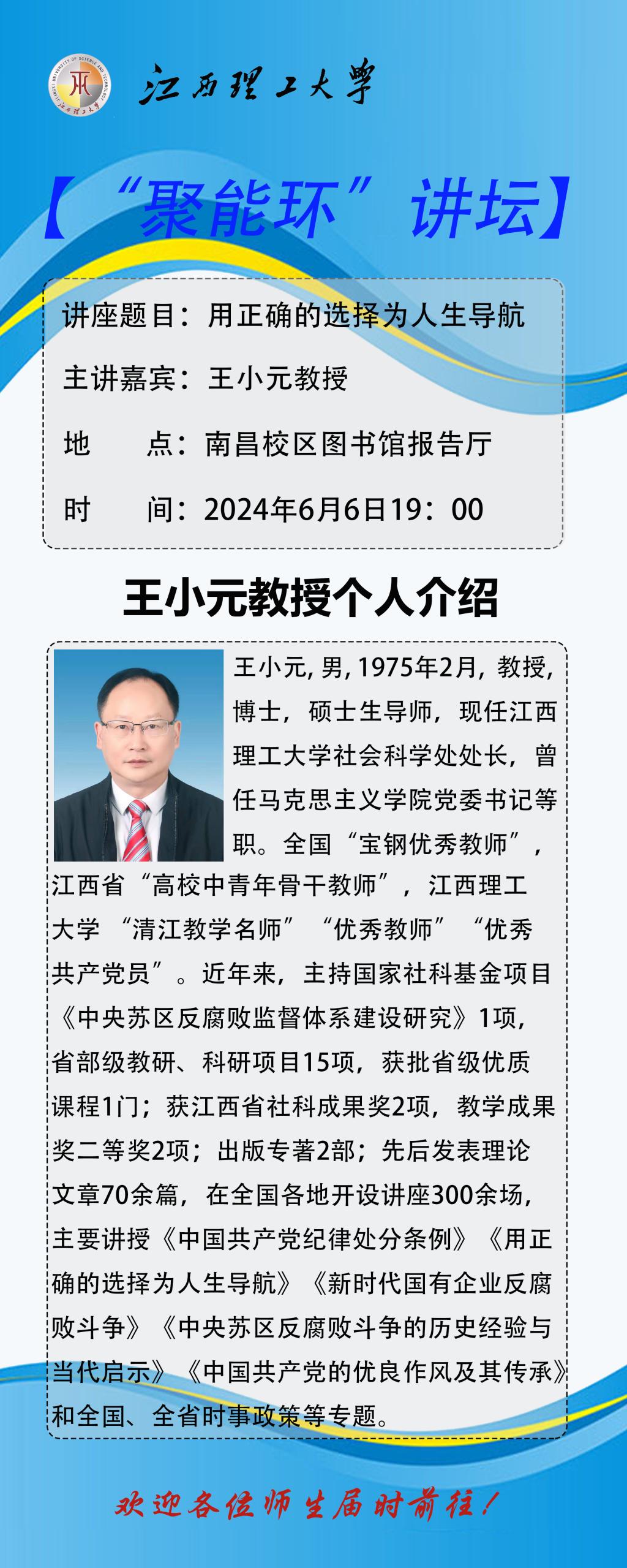 王小元,男,1975年2月,教授,博士,硕士生导师,现任金年会体育社会科学处处长,曾任马克思主义学院党委书记等职。全国“宝钢优秀教师”,江西省“高校中青年骨干教师”,金年会体育 “清江教学名师”“优秀教师”“优秀共产党员”。近年来,主持国家社科基金项目《中央苏区反腐败监督体系建设研究》1项,省部级教研、科研项目15项,获批省级优质课程1门;获江西省社科成果奖2项,教学成果奖二等奖2项;出版专著2部;先后发表理论文章70余篇,在全国各地开设讲座300余场,主要讲授《中国共产党纪律处分条例》《用正确的选择为人生导航》《新时代国有企业反腐败斗争》《中央苏区反腐败斗争的历史经验与当代启示》《中国共产党的优良作风及其传承》和全国、全省时事政策等专题。