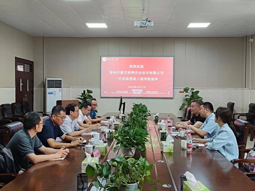 本网讯 为进一步加深校企合作交流,拓展办学资源,对接相关专业就业,9月12日上午,深圳开源互联网安全技术有限公司网安加学院院长宋荆汉一行莅临信息工程学院指导,在九章楼303会议室召开了校企合作座谈会。信息工程学院院长杨书新、党委副书记王吉源及相关教师出席会议。