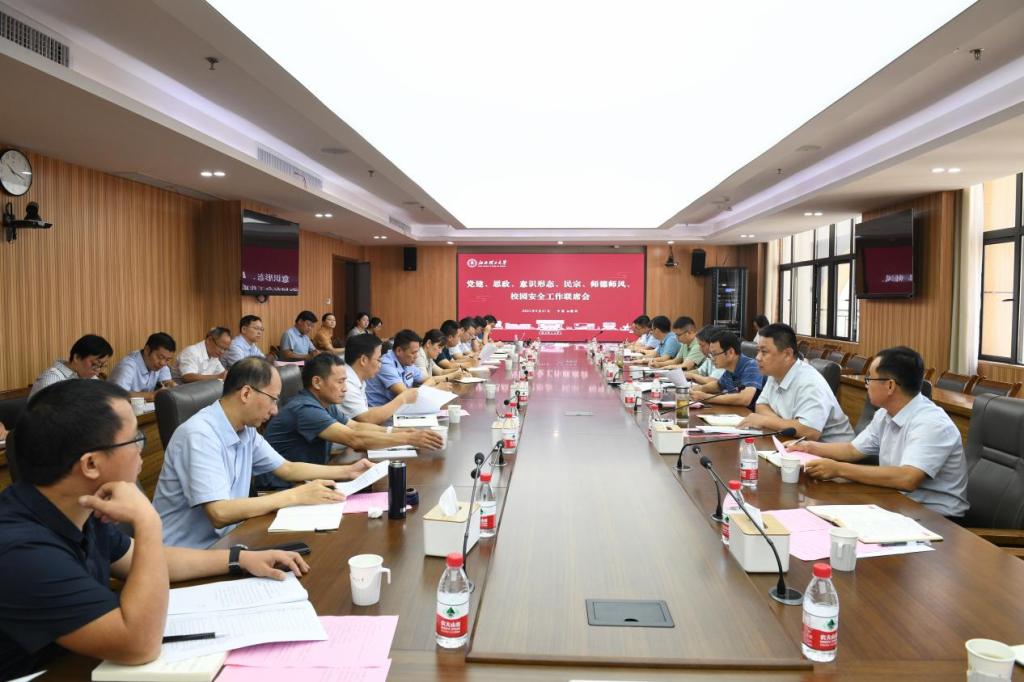 本网讯 9月21日上午,金年会体育 党建、思想政治、意识形态、民宗、师德师风、校园安全工作联席会在三江校区濂溪楼2号会议室召开。校党委副书记罗仙平,校党委常委、党委宣传部部长盛晓明,校党委常委、党委组织部部长刘志刚,相关职能部门负责人及各二级学院党委书记参加会议。南昌校区、先进铜产业学院(鹰潭)人员同步视频参会。罗仙平主持会议。