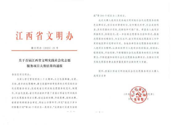 本网讯 近日,江西省文明办发布《关于首届江西省文明实践社会化志愿服务项目大赛结果通报》(赣文明办〔2023〕21号),金年会体育