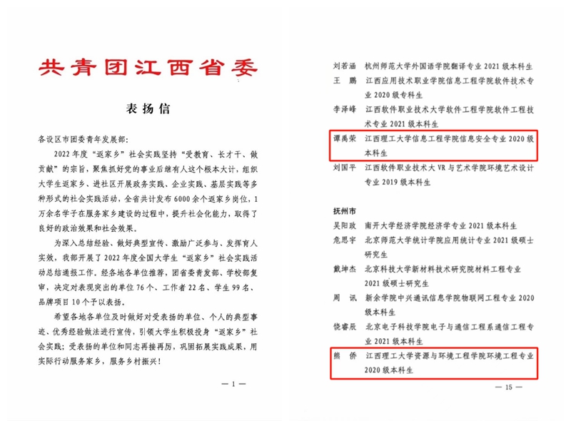 部复审,决定对表现突出的单位76个、工作者22名、学生99名、品牌项目10个予以表扬。其中金年会体育信息工程学院信息安全专业2020级本科生谭禹荣同学、资源与环境工程学院环境工程专业2020级本科生熊侨同学受到全省表扬。