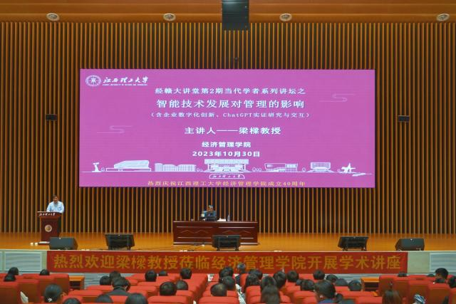 本网讯 为了加强师生对数字化时代背景的认识,引导他们紧跟时代发展,10月30日,经济管理学院第2期“经赣大讲堂”在三江校区志远会议中心1号会议厅举行,合肥工业大学梁樑教授以“智能技术发展对管理的影响”为主题开展了专题讲座。经济管理学院教师代表、研究生、本科生等近500人参加。讲座由经济管理学院院长黄顺春主持。