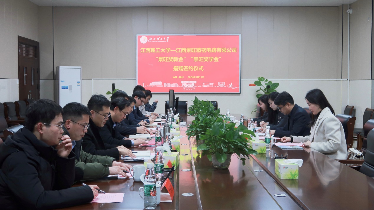 本网讯 3月13日下午,金年会体育“景旺奖教金”“景旺奖学金”捐赠签约仪式在三江校区九章楼303会议室举行。江西景旺精密电路有限公司信丰公司总经理张建庭,校党委常委、副校长熊志华出席会议。党委学生工作部等相关职能部门代表,理学院、信息工程学院代表及专业教师等参加捐赠签约仪式。