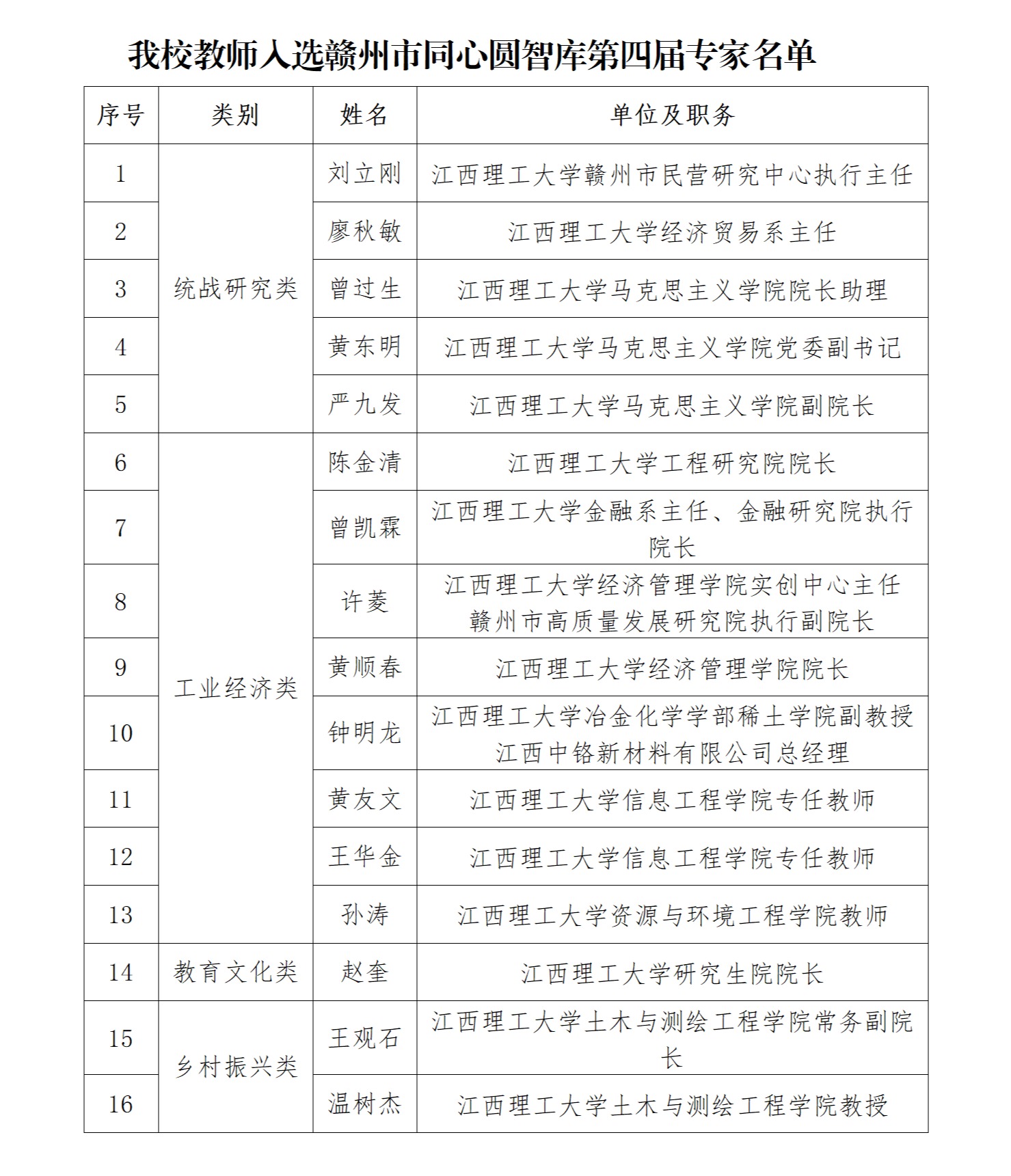 本网讯 近日,赣州市委统战部下发了《关于公布刘立刚等100位同志为赣州市同心圆智库第四届专家的通知》,金年会体育 刘立刚、廖秋敏、曾过生等16名教师入选赣州市同心圆智库第四届专家,其中党外代表人士10名。