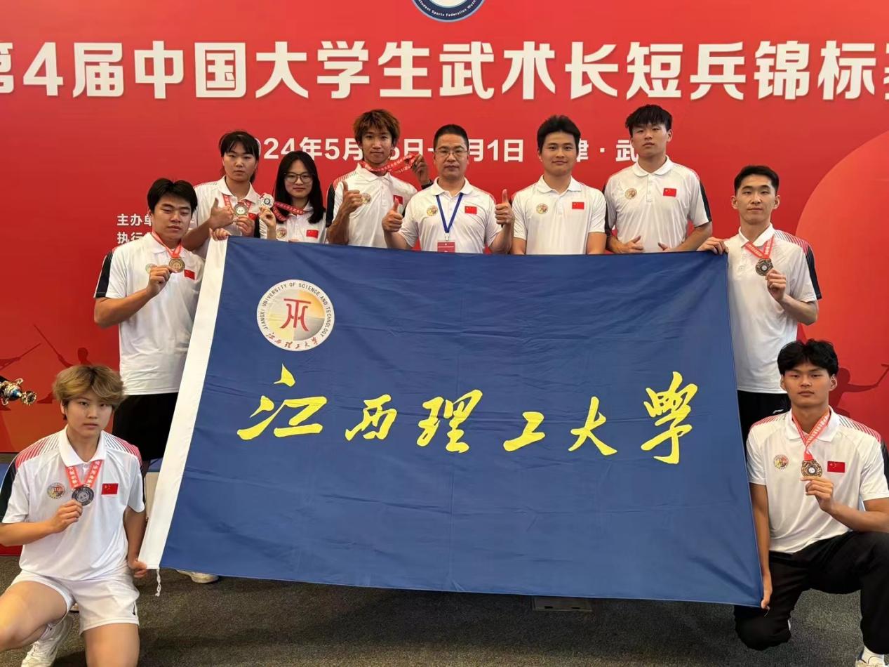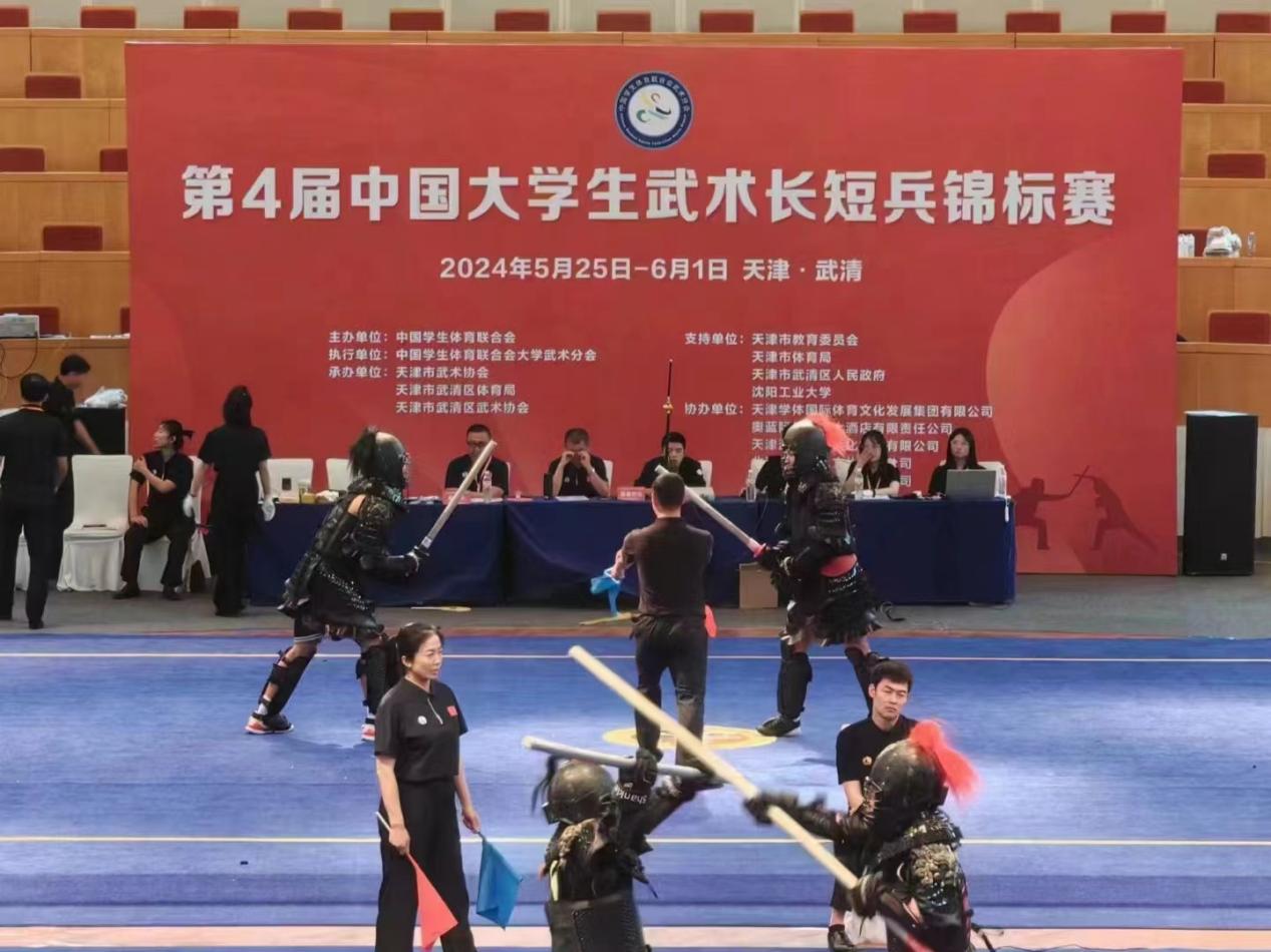 本网讯 5月27日,第四届中国大学生武术长短兵锦标赛在天津市武清区拉开帷幕。金年会体育 代表队在比赛中勇创佳绩,取得甲组3枚银牌、2枚铜牌、2个前五,丙组1枚铜牌,甲B组团体总分全国第四名的优异成绩,并获得体育道德风尚奖;杨帆同学获得“体育道德风尚运动员”称号。