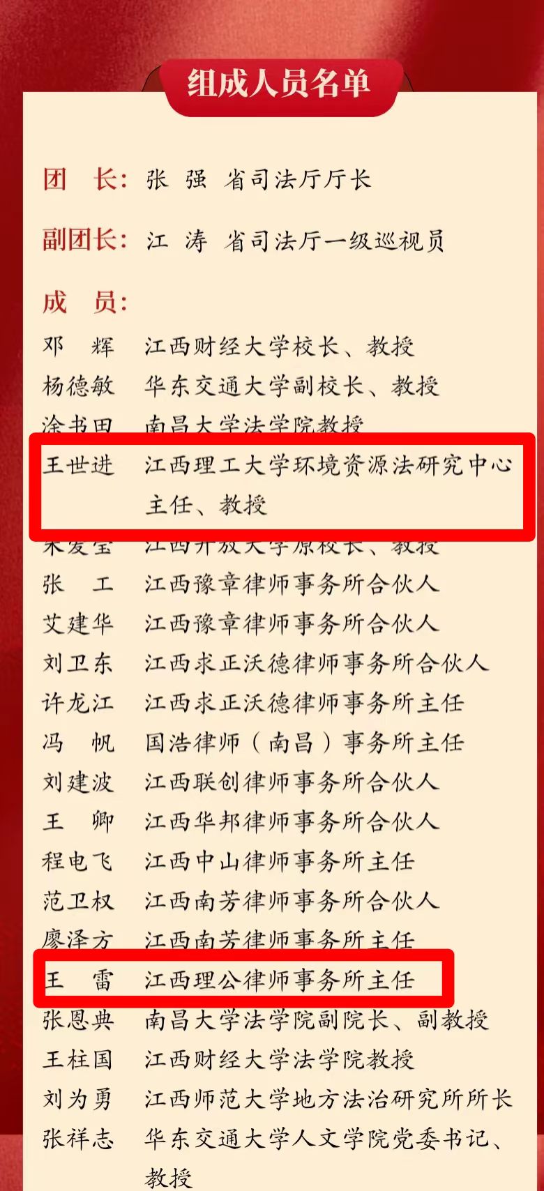 本网讯 为深入贯彻落实《中共中央办公厅、国务院办公厅印发关于推行法律顾问制度和公职律师公司律师制度的意见的通知》及中央全面依法治国委员会《关于切实加强党政机关法律顾问工作充分发挥党政机关法律顾问作用的意见》精神,充分发挥法律顾问在服务全省经济社会高质量发展、推进法治建设中的积极作用。近日,中共江西省委全面依法治省委员会正式公布第三届省法律顾问团组成人员名单,金年会体育 法学院环境资源法研究中心主任、教授王世进入选。