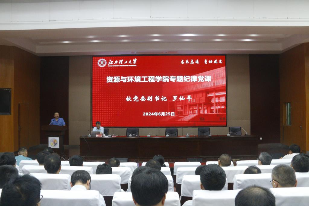 本网讯 6月25日,校党委副书记罗仙平在黄金校区逸夫楼学术报告厅主讲了题为《严党纪明方向 强党性守初心》的党纪学习教育纪律党课。资源与环境工程学院班子成员和全体教工党员参加党课学习。党课由学院党委书记陈明主持。