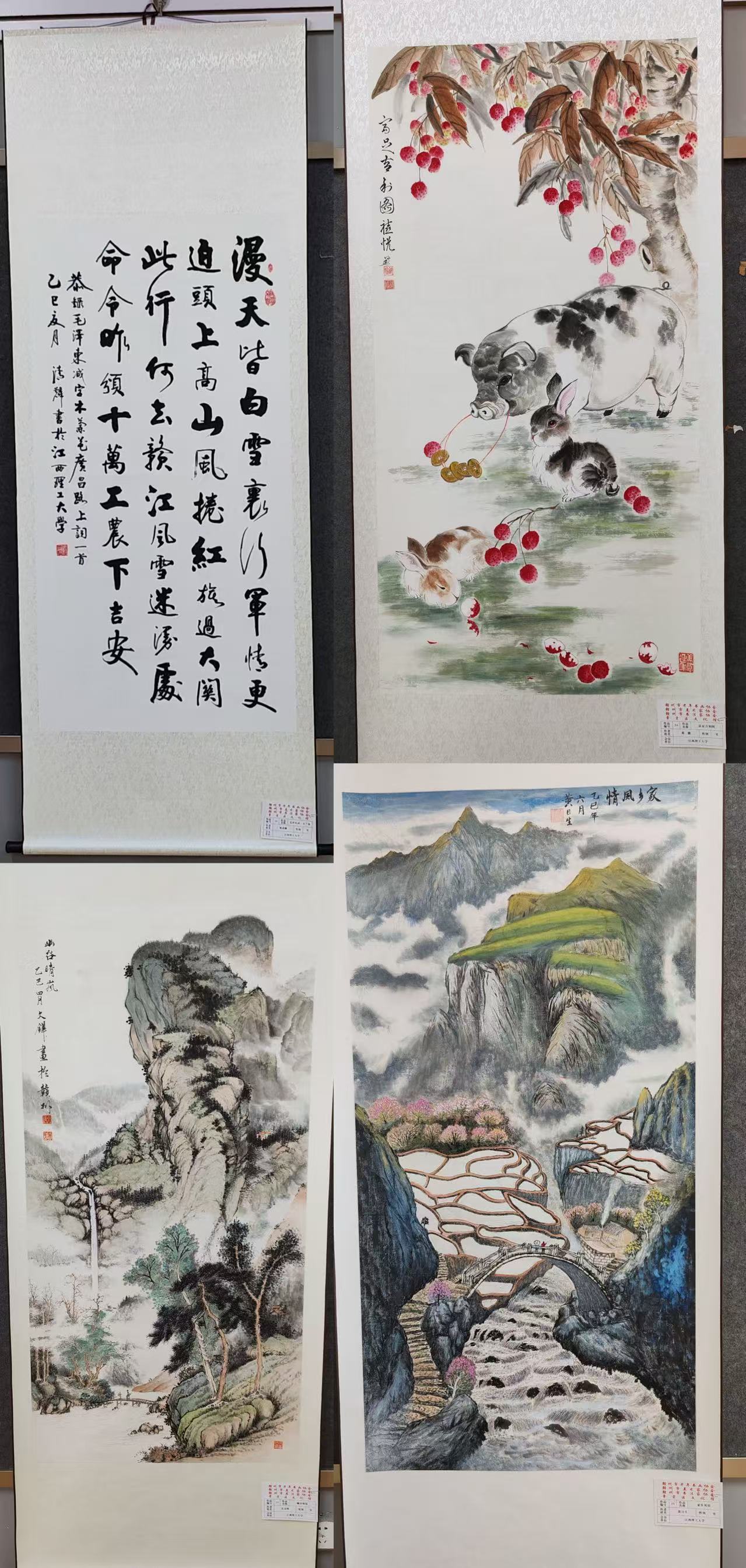 本次书画展由赣州市老年书画协会、赣州市美术家协会、赣州市书法家协会、章贡区文化馆共同主办。获奖作品分别是杨清麟的书法作品《毛泽东词·木兰花》、吴文铧的国画作品《幽谷晴岚》、蔡薇的国画作品《富足吉利图》、黄日生的国画作品《家乡风情》。