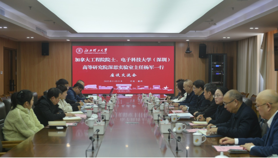 本网讯 11月21日,加拿大工程院院士、电子科技大学(深圳)高等研究院深思实验室主任杨军一行来访,校党委常委、副校长宁洁会见来宾并举行座谈交流会。校信息工程学院院长杨书新,章贡区委常委、常务副区长李明海,通用人工智能(赣州)研究院执行院长钱瑞等参加会议。会议由机电工程学院党委书记刘惠中主持。