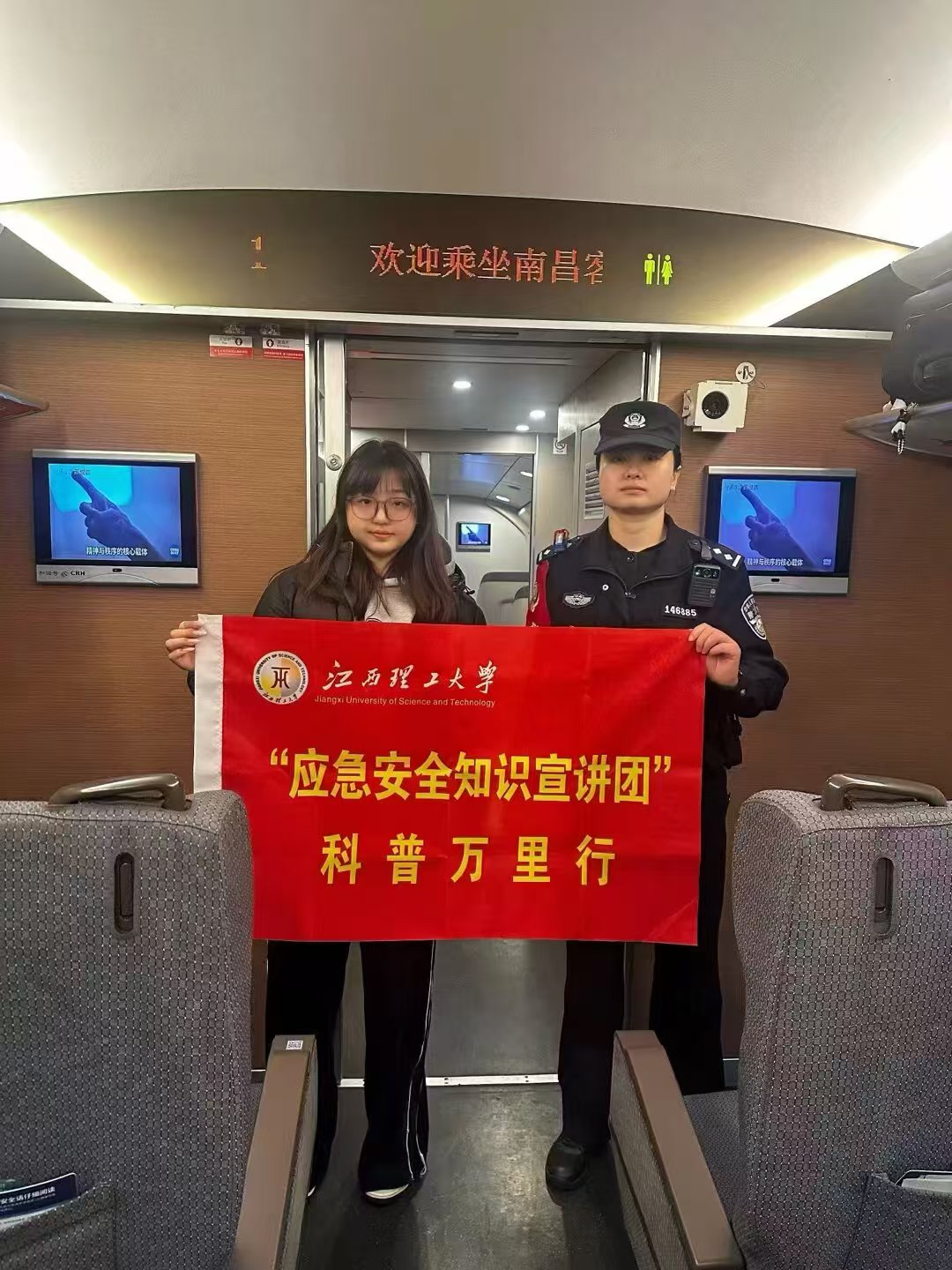安全工程学院联合赣州铁路公安处乘警支队,在G1354/G1355等13次列车开展“平安列车,青春护航”主题列车宣讲活动。学子们化身“流动安全员”,以专业行动筑牢旅途安全防线,让归乡之路满含平安与暖意。