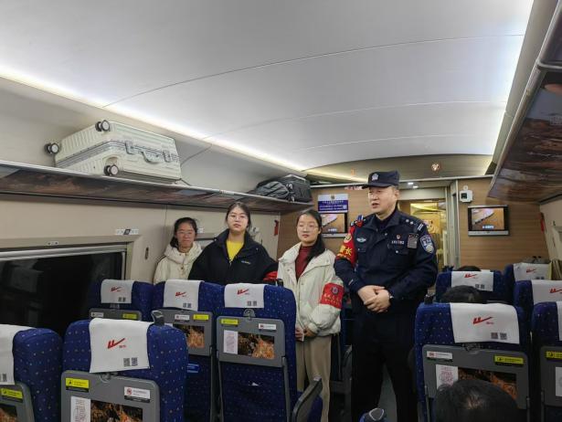 在乘警的陪同下,志愿者们走进车厢,以饱含热情的问候开启互动篇章,为这段归途铺就温暖序幕。围绕旅途核心安全需求,他们聚焦反诈防盗技巧、应急避险要点、出行安全常识以及公共卫生防护等系列内容进行宣讲,并融入鲜活案例,以案释教,让安全知识更易理解;同时设置互动问答环节,以双向交流巩固宣讲效果,全力守护旅客人身与财物安全。